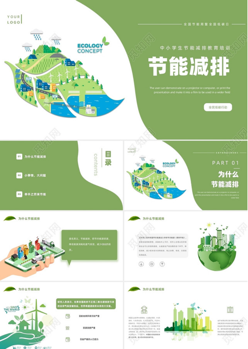 绿色简约扁平卡通节能减排节能环保PPT模板